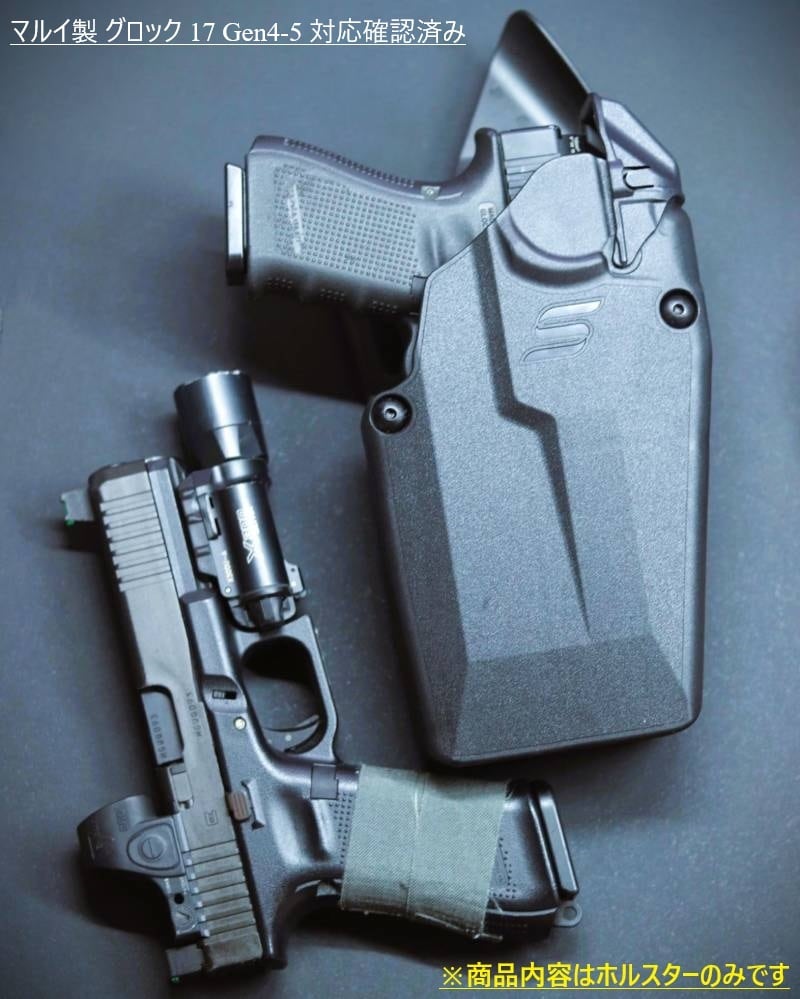 (ご注意) スライド部分でホルスターに固定する為、セレクターの付いたGlock18Cやスライドが通常のエアガンより分厚いマルイ製 Glock17 Gen3やDouble Bell 製 Glock34は非対応です。