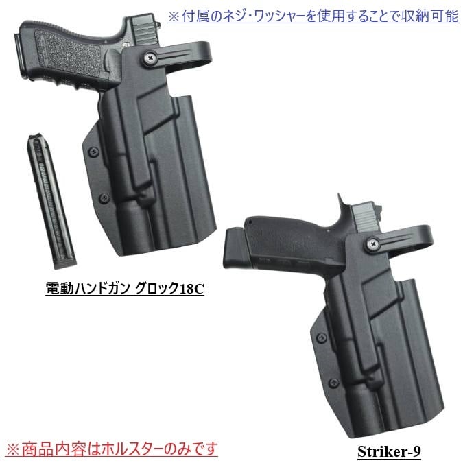 ●ホルスターに付属するネジ・ワッシャーを使用することで、電動ハンドガン Glock18Cやストライカー9を収納することができます。
