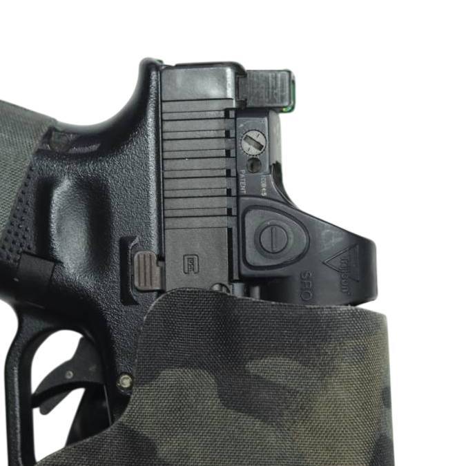 (ご注意) スライド部分でホルスターに固定する為、セレクターの付いたGlock18Cやスライドが通常のエアガンより分厚いマルイ製 Glock17 Gen3などは非対応です。